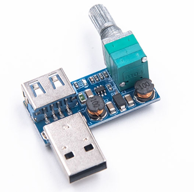| 1USB fan speed control module Input: Can be connected to the computer USB port, mobile phone charger, power bank Output: Can connect fan Input voltage: DC4~12V Output voltage: DC2.5~7.5V Output power: 5W(max) Item size: 32MM * 12MM * 12MM Item weight: 0.012kg Turn the knob clockwise to increase the air volume, counterclockwise to reduce the air volume |